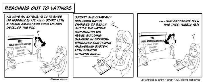 A satirical perspective of Latinos living and working in the U.S. It's a creative way of putting latinos' everyday life into cartoon satire. Created by Michael Jackaman and Lorena Mora-Mowry